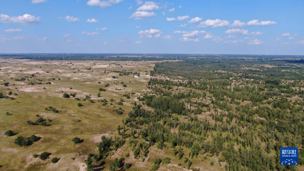 這是科爾沁沙漠南端和彰武縣章古臺固沙林場接壤處的航拍圖(新華社記者 楊青 2021年8月30日攝)。