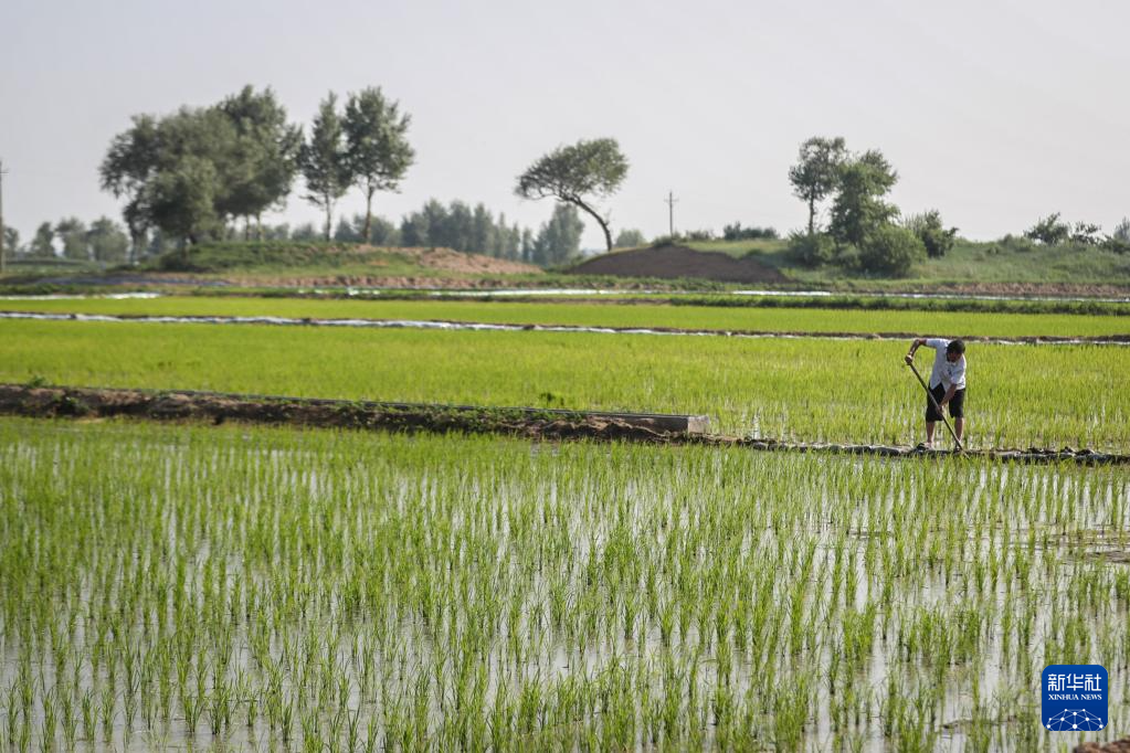 農戶在阜新市彰武縣大冷鎮的水稻田里進行日常維護工作(新華社記者 潘昱龍 2023年6月14日攝)。