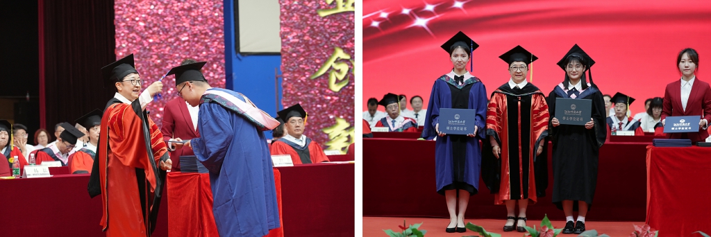 今年,沈陽師范大學共有4349名本科生、1296名碩士研究生和24名留學生畢業。在莊嚴而隆重的學位授予儀式上,校學位評定委員會主席、校長楊松教授為各專業畢業生代表撥流蘇、頒發學位證書,并留下珍貴合影。
