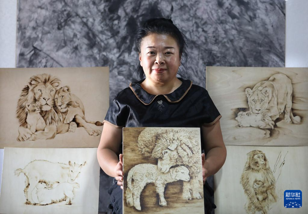 7月6日,李影在位于遼寧省營口市大石橋的工作室里展示她的系列木板烙畫作品《動物的母愛》。新華社記者 姚劍鋒 攝pagebreakpagebreak