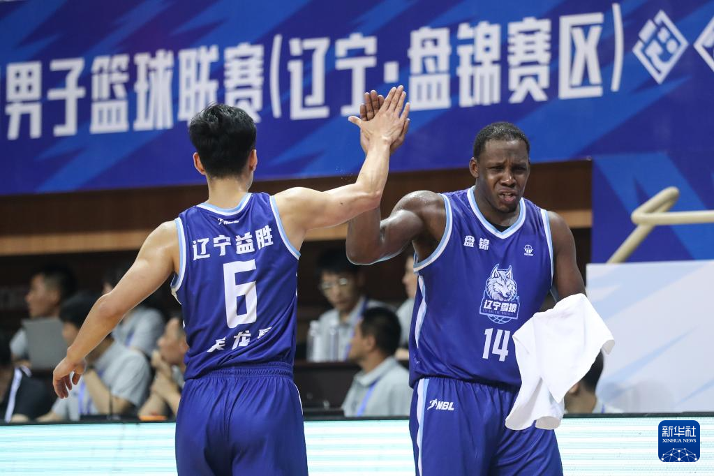7月9日,遼寧益勝隊球員哈德森(右)與隊友吳龍昊擊掌慶祝。新華社記者 潘昱龍 攝