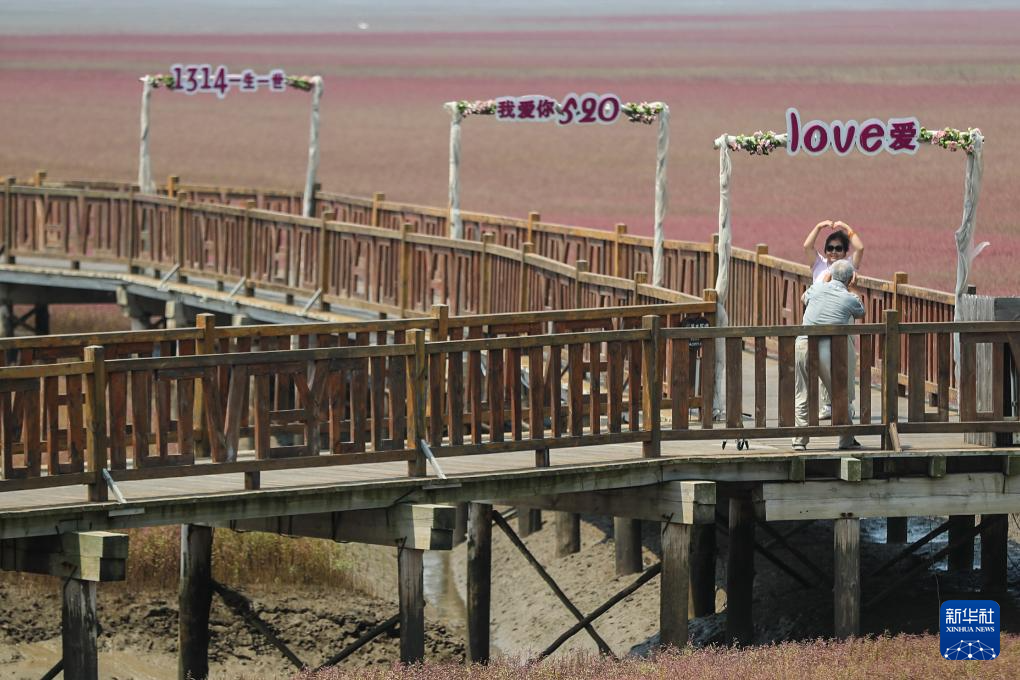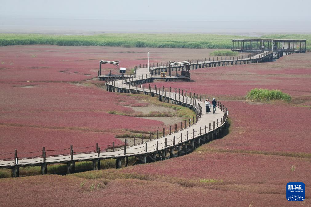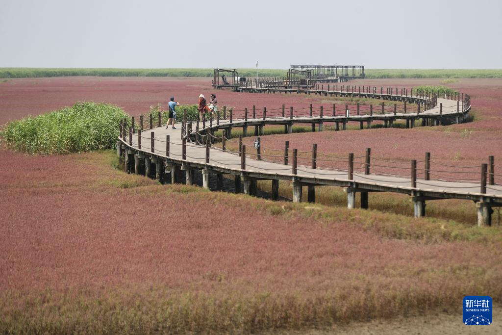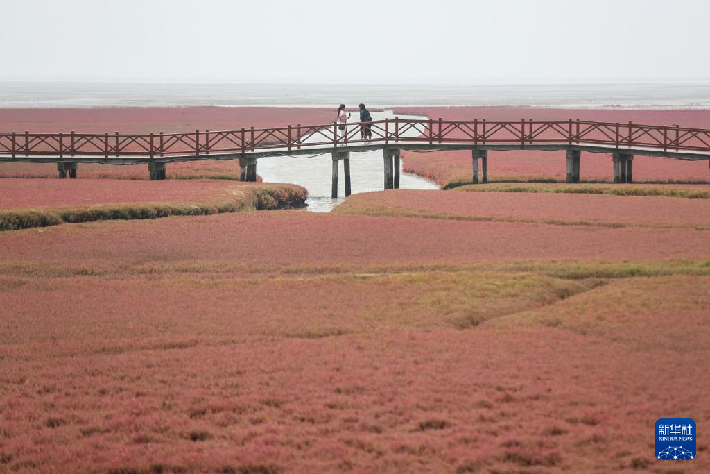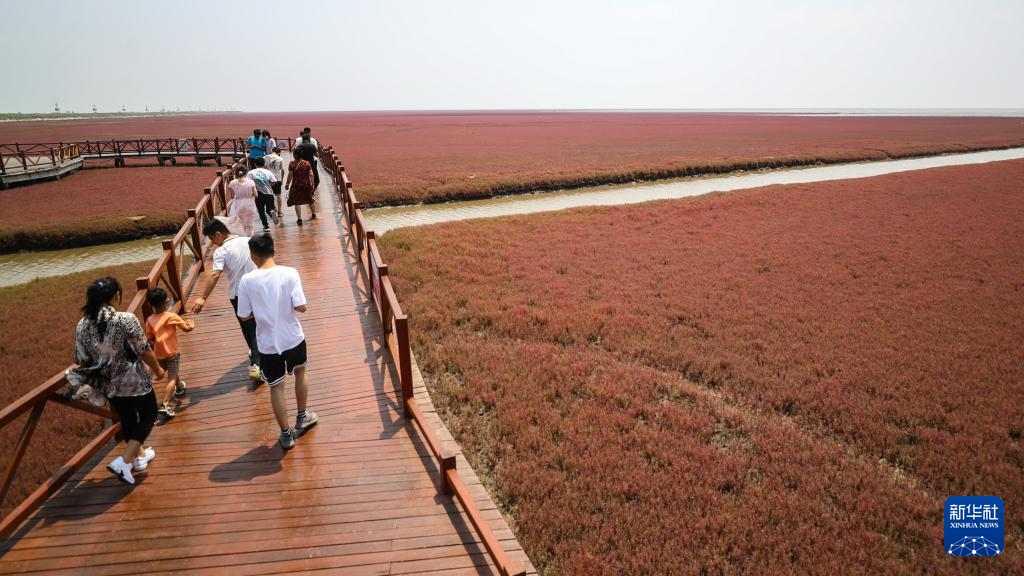 近日,遼寧盤錦紅海灘國家風景廊道內的堿蓬草迎來最佳觀賞期,紅灘綠葦,景色優美,吸引游客前來觀賞游玩。新華社記者 潘昱龍 攝