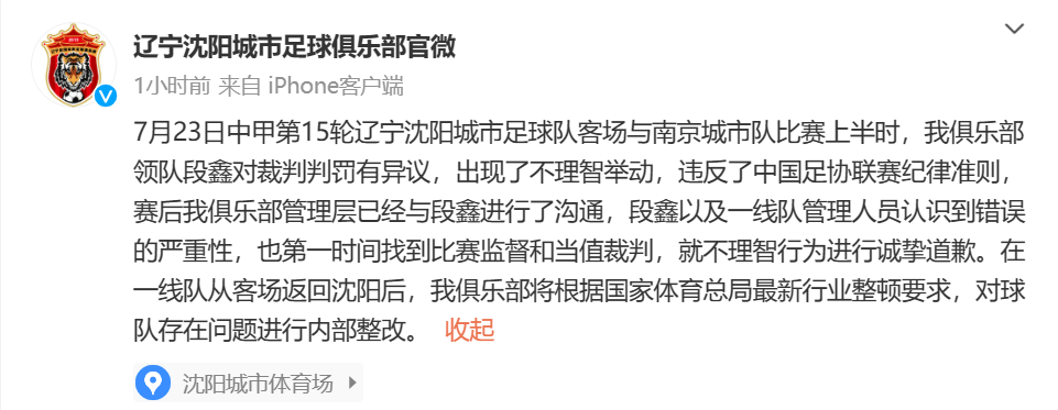 當日23時03分,遼寧沈陽城市足球俱樂部發布公告稱,俱樂部領隊段鑫對裁判判罰有異議,出現了不理智舉動,違反了中國足協聯賽紀律準則,賽后俱樂部管理層已經與段鑫進行了溝通?!岸析我约耙痪€隊管理人員認識到錯誤的嚴重性,也第一時間找到比賽監督和當值裁判,就不理智行為進行誠摯道歉。在一線隊從客場返回沈陽后,俱樂部將根據國家體育總局最新行業整頓要求,對球隊存在問題進行內部整改?!?/p>