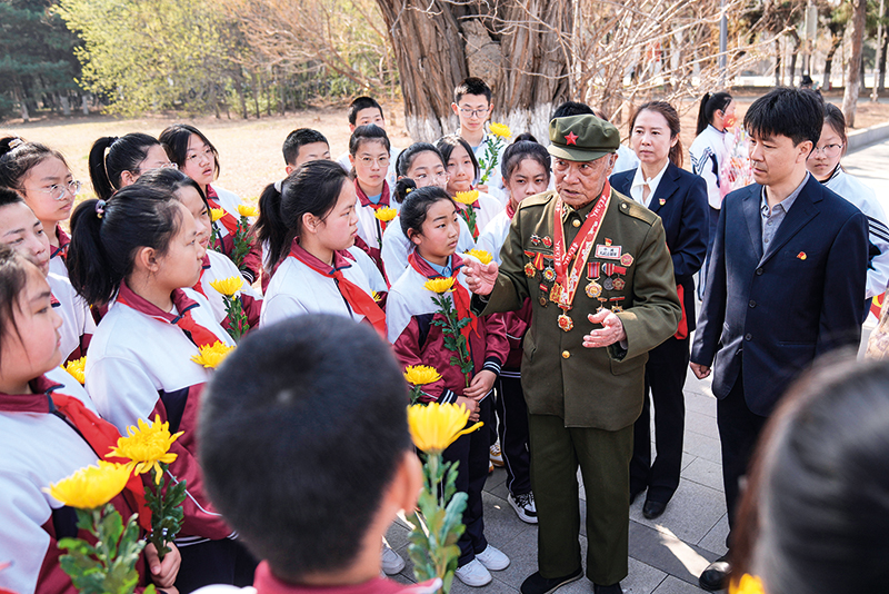 志愿軍老兵李維波在沈陽抗美援朝烈士陵園內為學生們講述戰爭經歷(2023年4月3日攝) 潘昱龍攝/本刊