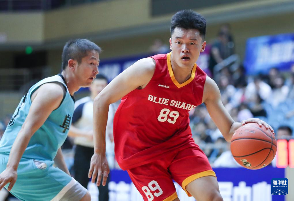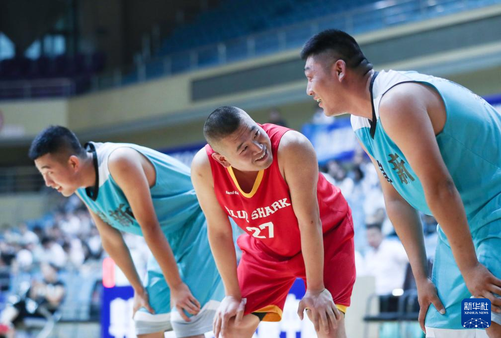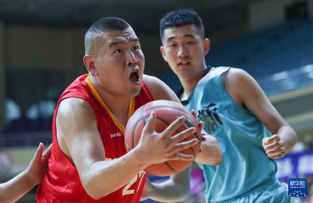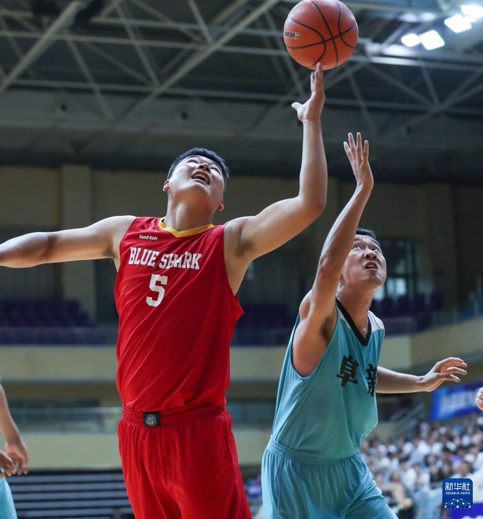 8月8日,藍鯊俱樂部球員黨洪峰(左)在開幕式的籃球表演賽中拼搶。新華社記者 龍雷 攝pagebreak
