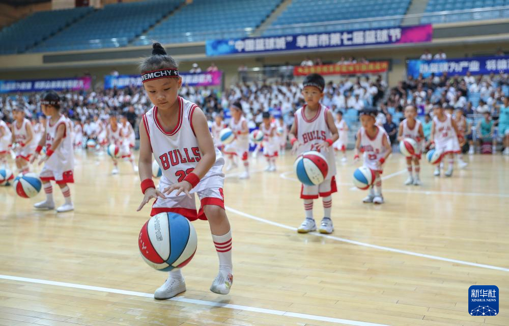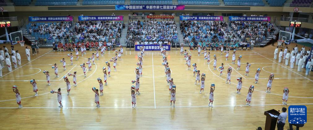 8月8日,小朋友在阜新市第七屆籃球節開幕式上表演籃球操。當日,遼寧省阜新市第七屆籃球節開幕。本次活動旨在塑造籃球城市形象,引領全民健身,提高人民健康水平。新華社記者 龍雷 攝pagebreak