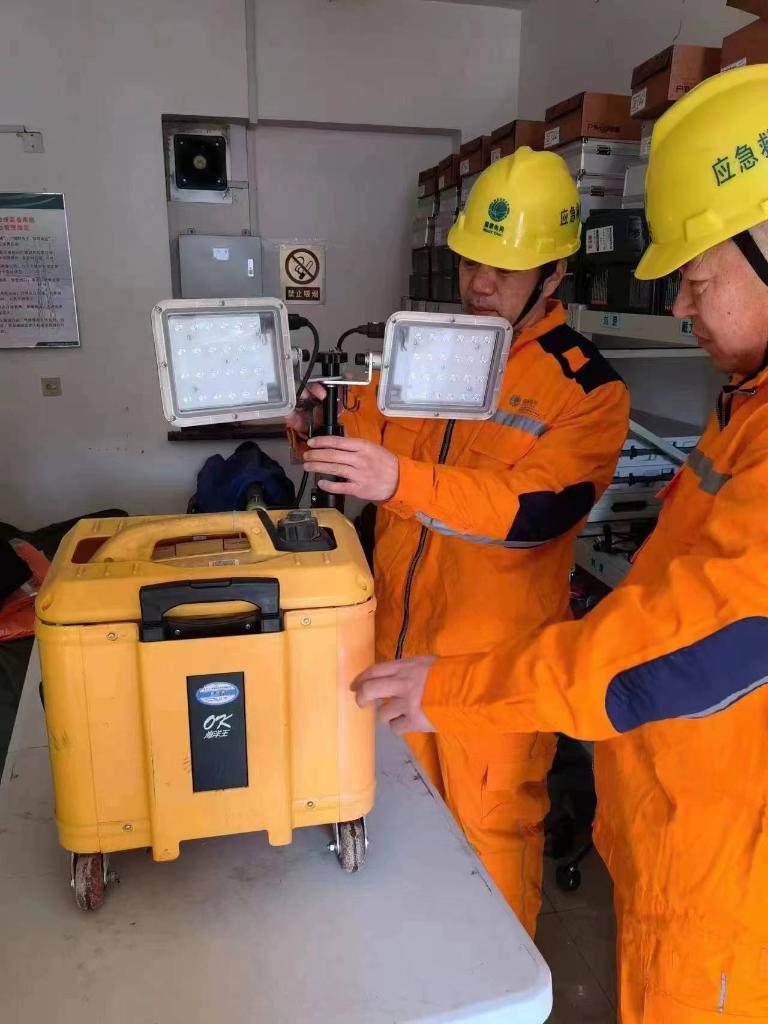 在鳳城市藍旗鎮廣勝村小學臨時安置點,藍旗鎮供電所工作人員正在調試應急照明設備。(國網丹東供電公司供圖)