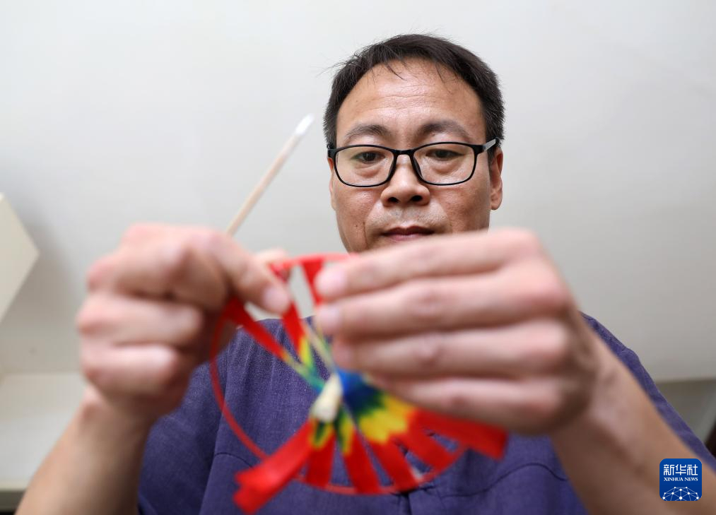 8月17日,崔凱在遼寧省營口市自己家中制作吉祥輪彩紙風車轉輪。新華社記者 姚劍鋒 攝pagebreak
