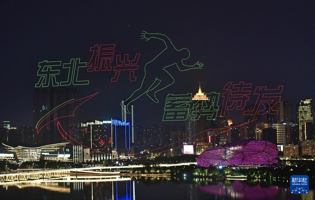 8月17日,在沈陽渾河上空區域,無人機展示“東北振興 蓄勢待發”字樣。新華社記者 楊青攝
