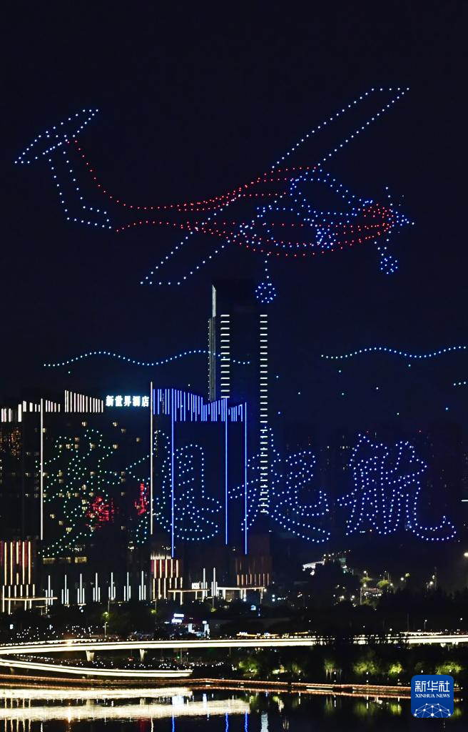 8月17日,在沈陽渾河上空區域,無人機展示“沈水之陽 我心向往”字樣。新華社記者 楊青攝pagebreak
