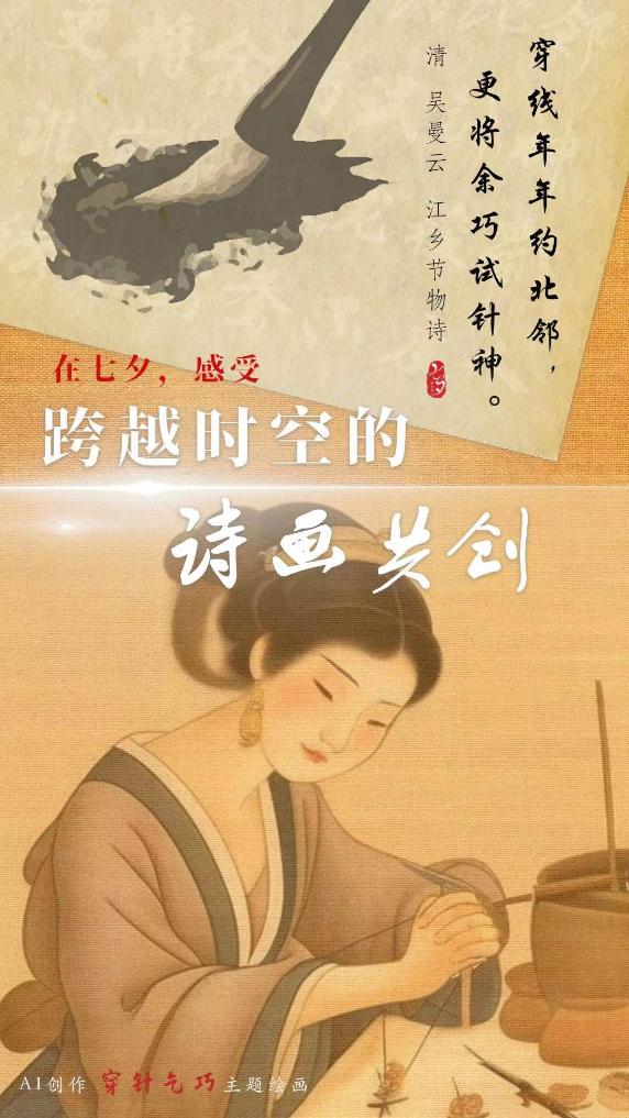 清代吳曼云《江鄉節物詩·試針》中說:“穿線年年約北鄰,更將余巧試針神?!惫糯釉谄呦χ故謭涛迳z線和連續排列的九孔針(或五孔針、七孔針)趁月光對月連續穿針引線,將線快速全部穿過者稱為“得巧”,展現了古代中國勞動人民的聰明才智和生活向往。AI由此創作一幅穿針乞巧圖。策劃:于也童、劉藝淳、闞思邈