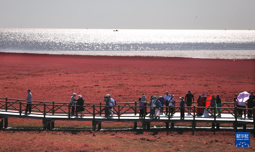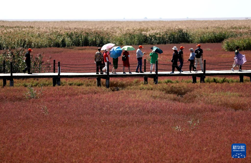 9月12日,游客在盤錦紅海灘國家風景廊道景區游覽。新華社記者 姚劍鋒 攝