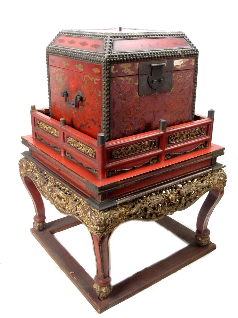 此次展出的“清朱漆描金雕云龍國寶盒”,就是這類裝具的代表之一。這套國寶盒為盛裝清初皇帝玉璽的套盒,專門用于盛裝皇太極至康熙時期的十方玉璽。乾隆十一年(公元1746年),清高宗弘歷傳旨將清初皇帝玉璽“盛京十寶”恭貯盛京皇宮,尊藏于鳳凰樓之中,并特別制作盛放玉璽的裝具——國寶盒。