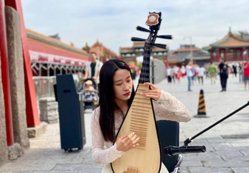 29日,記者來到沈陽故宮博物院,看到大量觀眾在門口排隊等待參觀。為舒緩觀眾排長隊入館的心情,沈陽故宮博物院還邀請文化志愿者在排隊區域進行小提琴、琵琶、二胡演出。