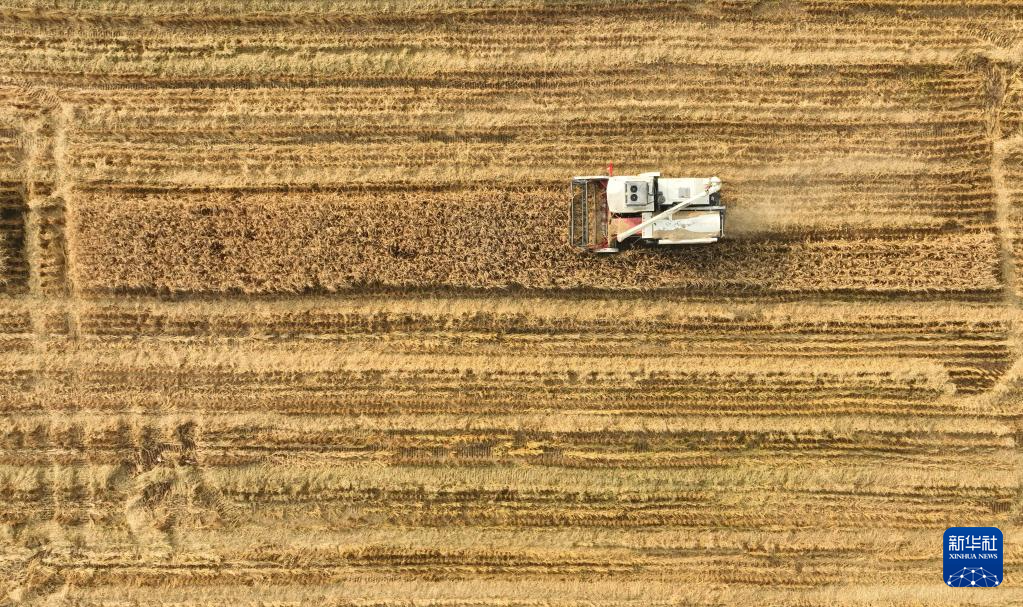 10月23日,水稻收割機在彰武縣大冷鎮上三家子村的稻田中收割水稻(無人機照片)。新華社記者 龍雷 攝