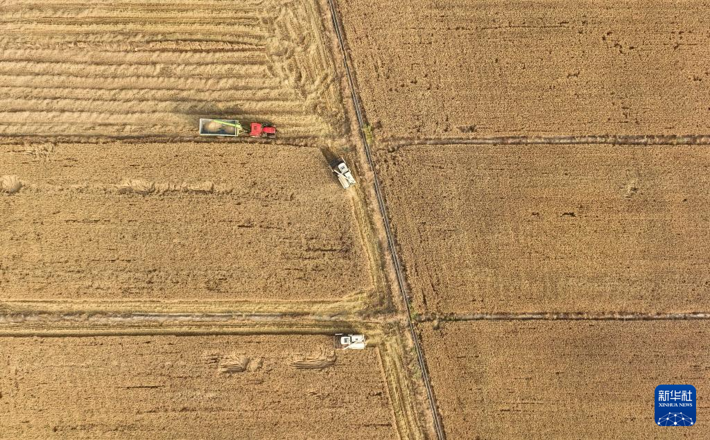 10月23日,水稻收割機在彰武縣大冷鎮上三家子村的稻田中將水稻裝車(無人機照片)。新華社記者 龍雷 攝pagebreak