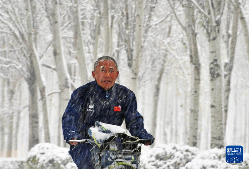 11月6日,在沈陽市渾南區,快遞員在雪中送快遞。新華社記者 楊青 攝