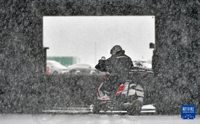 11月6日,在沈陽市渾南區,外賣員在雪中送外賣。新華社記者 楊青 攝pagebreak