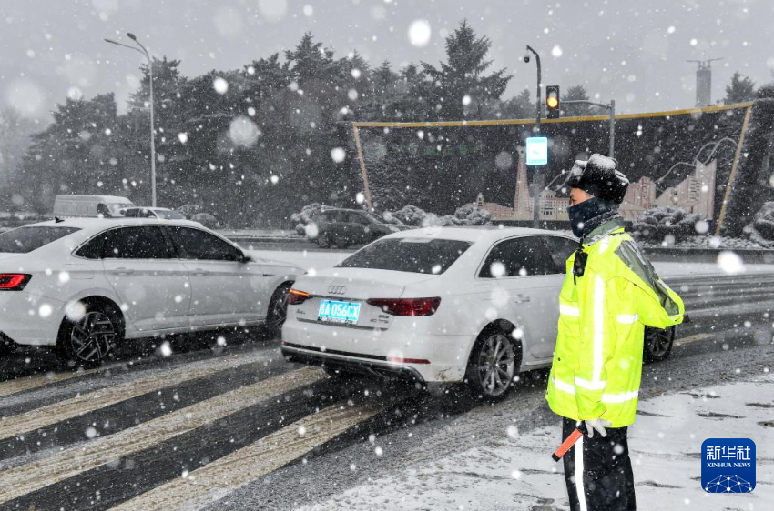 6日,在吉林省長春市,一名執勤交警在雪中指揮交通。新華社記者許暢 攝