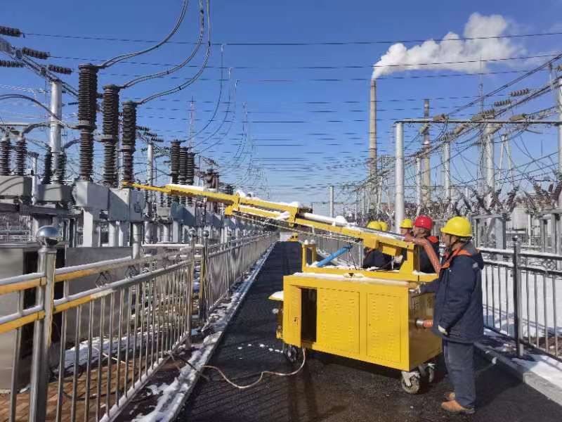 國網撫順供電公司運維人員利用移動式融冰裝置開展設備清雪工作。(國網撫順供電公司供圖)