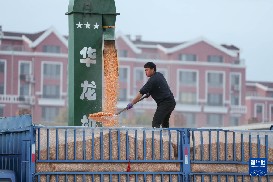 10月17日,官營子村村民將玉米粒裝車。新華社記者龍雷攝pagebreak