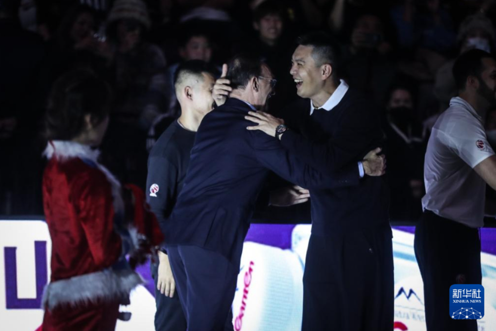 11月15日,在賽前領取冠軍戒指儀式中,前遼寧本鋼隊主教練楊鳴(右二)與現任遼寧本鋼隊主教練烏戈擁抱。新華社記者 潘昱龍 攝