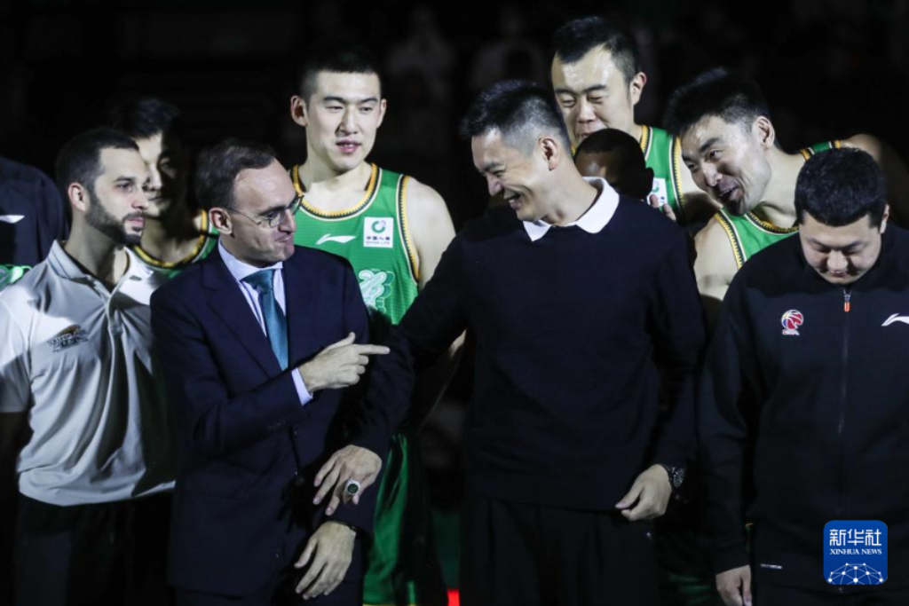 11月15日,在賽前領取冠軍戒指儀式中,前遼寧本鋼隊主教練楊鳴(前右二)與現任遼寧本鋼隊主教練烏戈(前左二)交流。新華社記者 潘昱龍 攝pagebreak