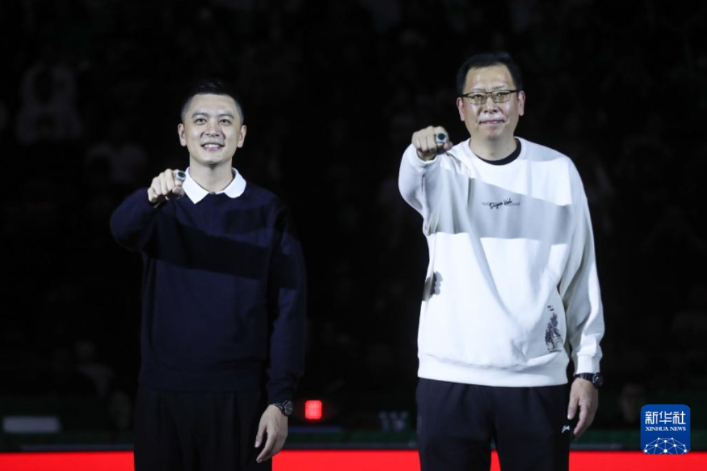 11月15日,前遼寧本鋼隊主教練楊鳴(左)與前遼寧本鋼隊助理教練吳乃群在賽前領取冠軍戒指。新華社記者 潘昱龍 攝pagebreak