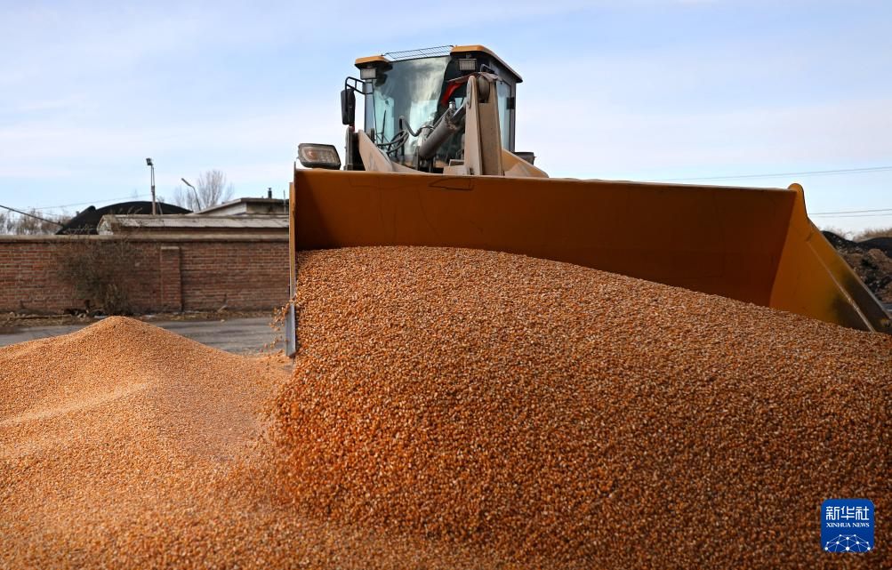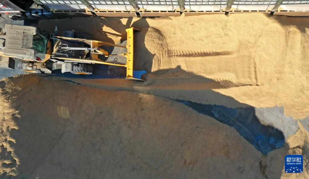 11月16日,工人駕駛鏟車在遼寧省臺安縣桓洞鎮的一家糧庫內卸載玉米。新華社記者 姚劍鋒 攝pagebreak