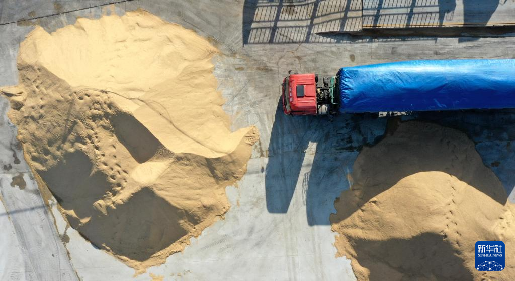11月16日,工人在遼寧省臺安縣鞍山滿豐糧食貿易有限公司糧庫內卸載玉米。新華社記者 姚劍鋒 攝
