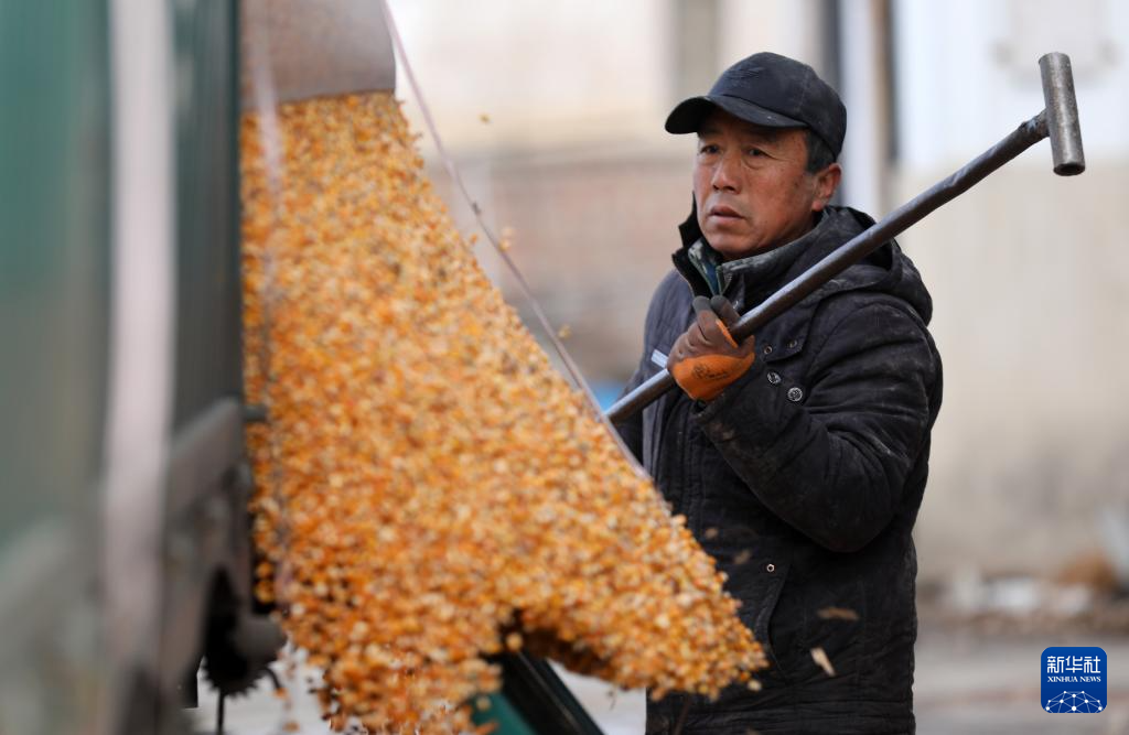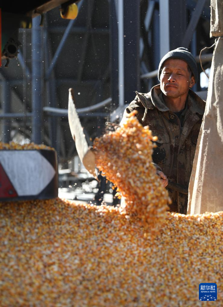 11月16日,工人在遼寧省臺安縣桓洞鎮的一家糧庫內卸載玉米。新華社記者 姚劍鋒 攝pagebreak