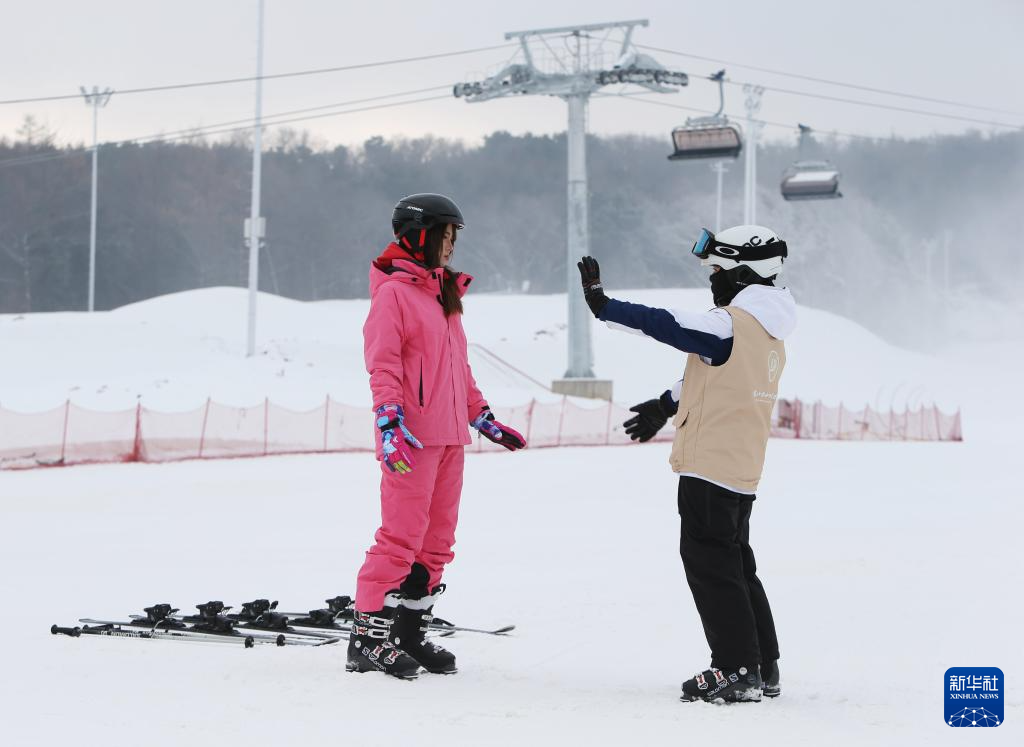 11月26日,滑雪教練在沈陽市東北亞滑雪場內指導一名滑雪愛好者。新華社記者 陳為 攝pagebreak