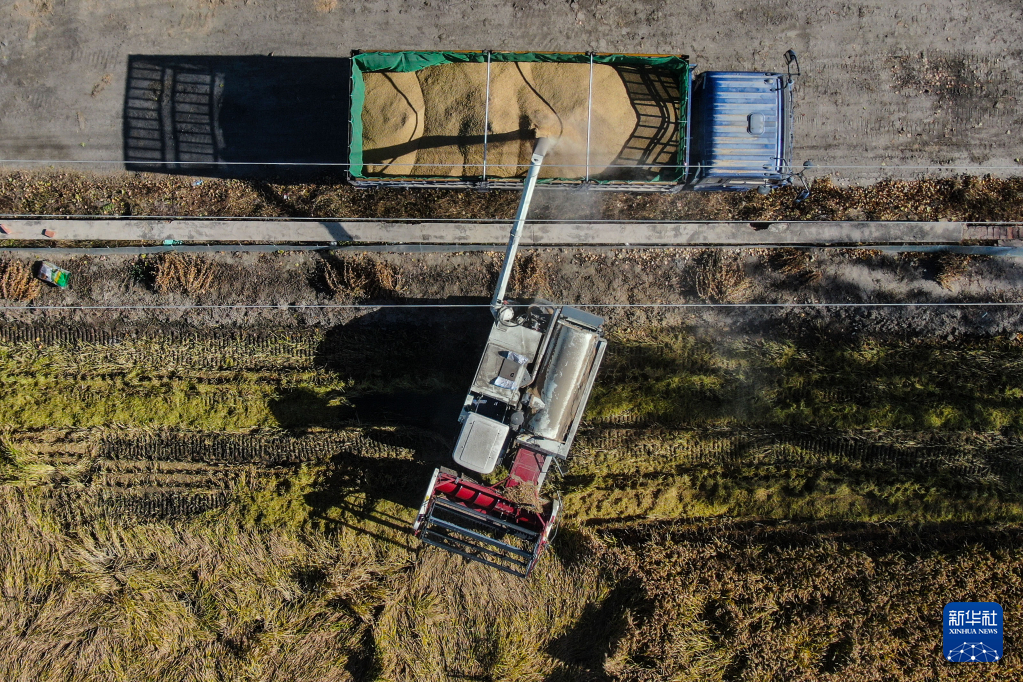 11月3日,農戶在盤錦市大洼區王家街道興海村將收割的水稻裝車(無人機照片)。新華社記者潘昱龍 攝