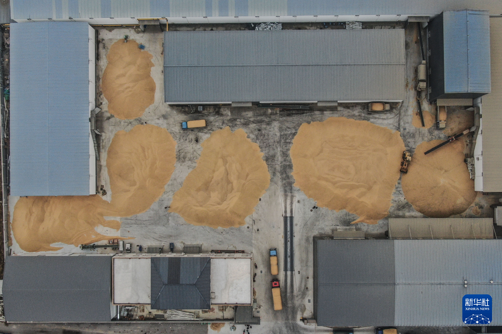 11月2日,農戶將收獲的稻谷送往盤錦市大洼區一家糧食加工企業(無人機照片)。新華社記者潘昱龍 攝