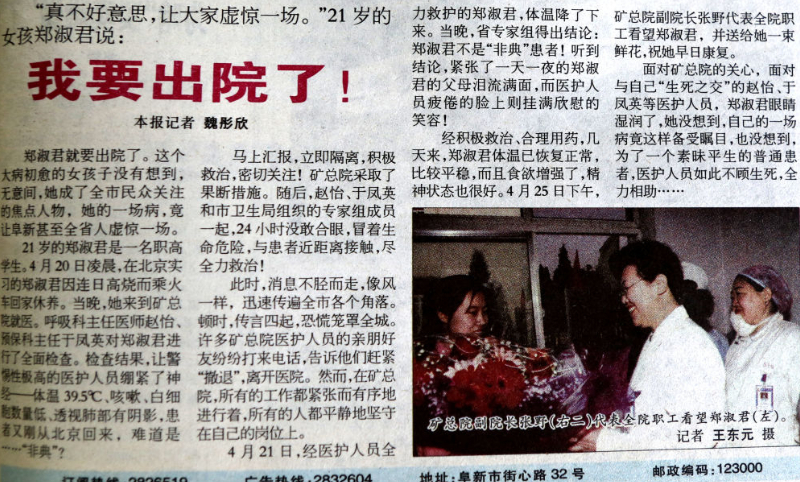 作為部門領導,她依然表現出色,2003年“非典”期間,她擔任阜新晚報要聞部主任,她提出“最危險的地方,我先上!”4月20日,有一個學生從北京回來,因為高燒不退被懷疑為感染“非典”,一時間謠言四起,恐慌籠罩全城,魏彤欣一個人冒著風險深入醫院跟蹤采訪,在得知確診不是“非典”后,第一時間發出了報道《我要出院了》,及時消除了公眾恐慌情緒。她帶領記者深入發熱門診、城市出入口的檢查站和醫護人員之間,掌握了大量的一手材料,共采寫了70余篇稿件,她本人被評為“遼寧省抗擊非典新聞宣傳先進個人”,她所在的部門被評為“遼寧省抗擊非典新聞宣傳先進集體”。