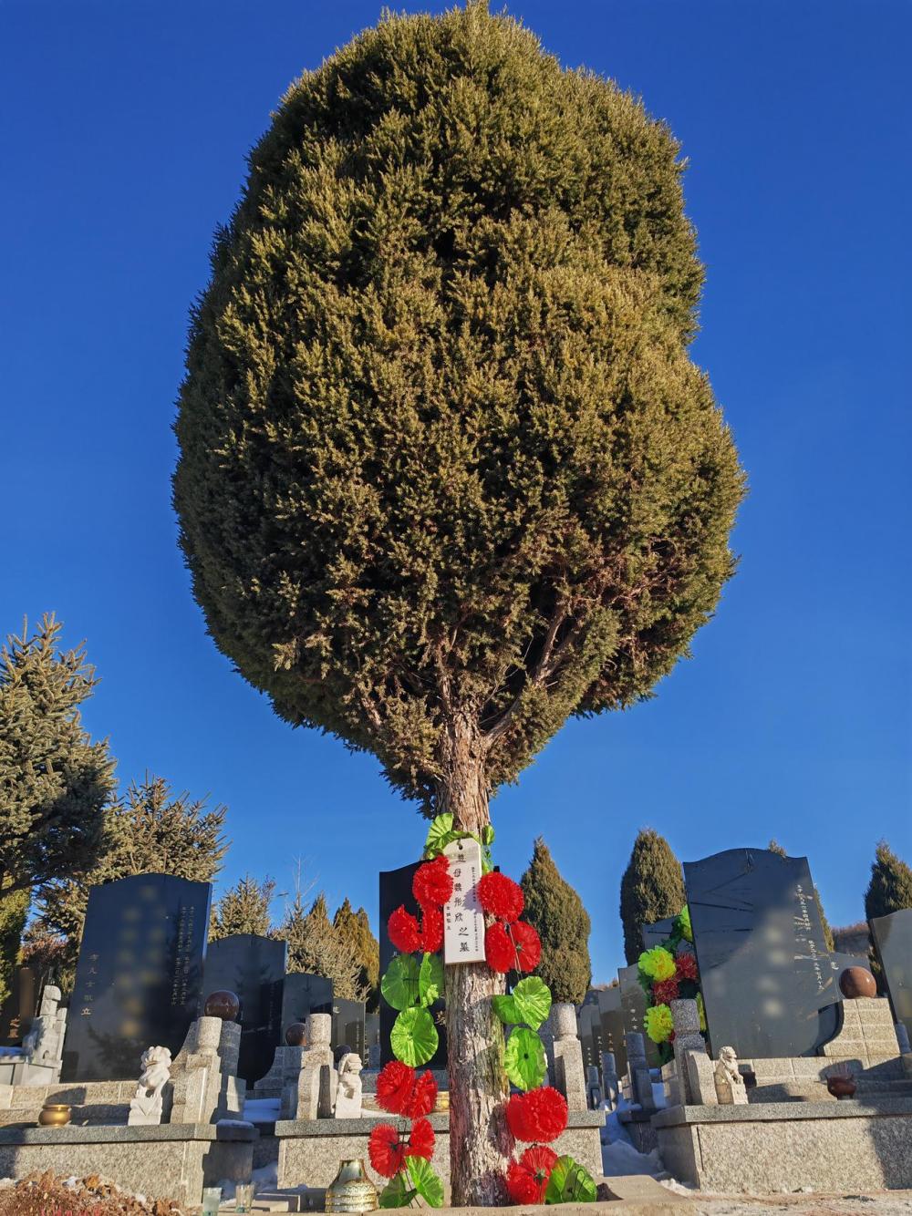 遼寧阜新市公墓的東南角,一棵挺拔翠綠的柏樹樹干上,掛有一個長30厘米、寬10厘米的小木牌,上寫有“魏彤欣之墓”,一束花環環繞周圍,在陽光的照耀下格外絢麗。