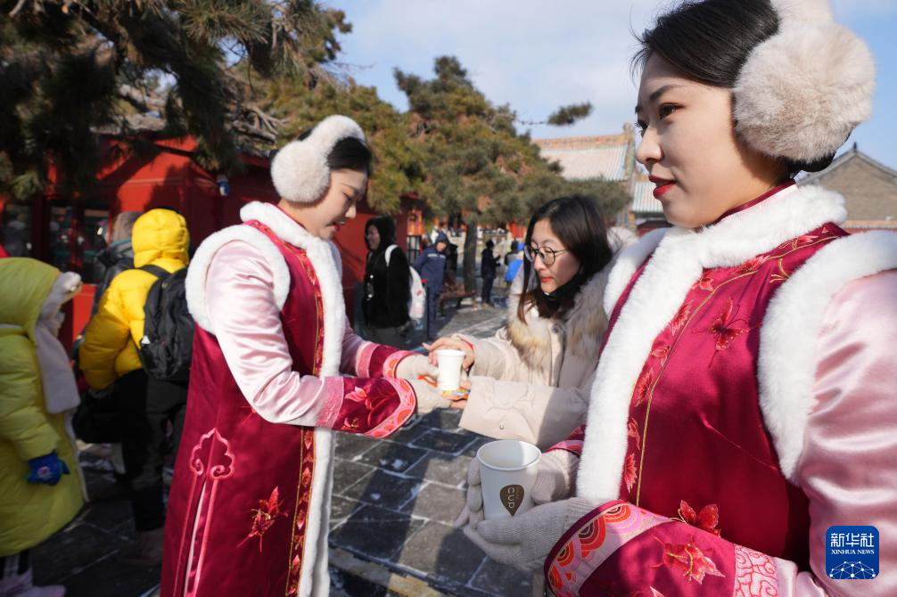 1月21日,沈陽故宮的工作人員為游客提供姜糖水和暖貼。新華社記者 龍雷 攝