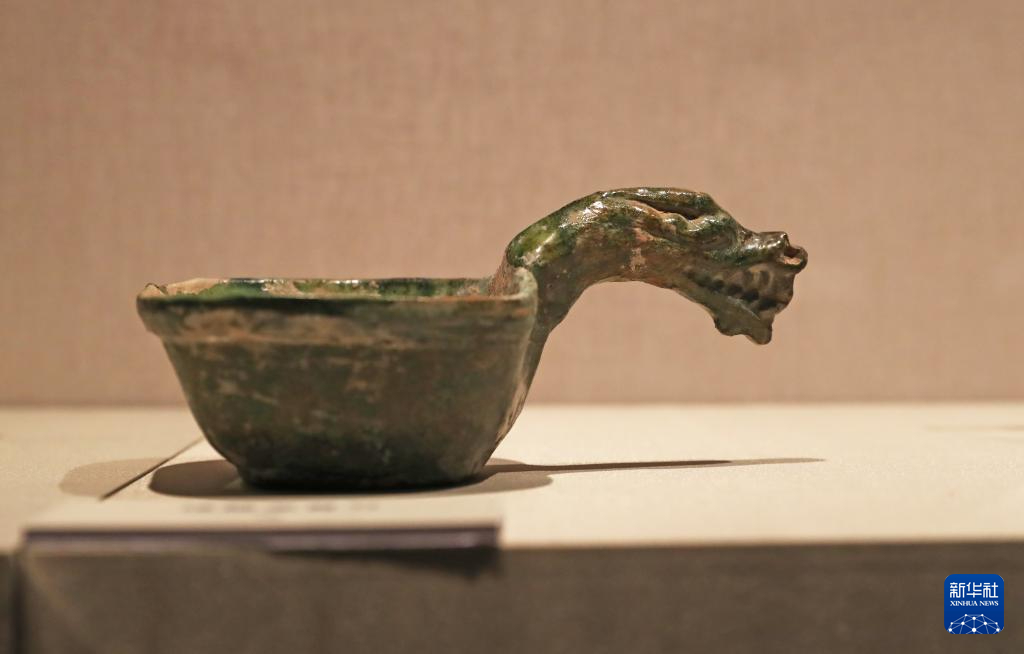 2月2日在遼寧省博物館拍攝的綠釉龍首勺。新華社記者 楊青 攝