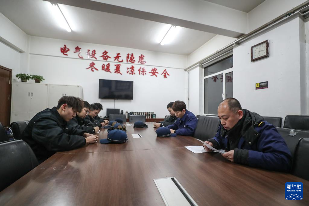 2月4日,開工前,田鶴(右一)與同事進行交班會,安排當天工作。新華社記者 潘昱龍 攝pagebreak