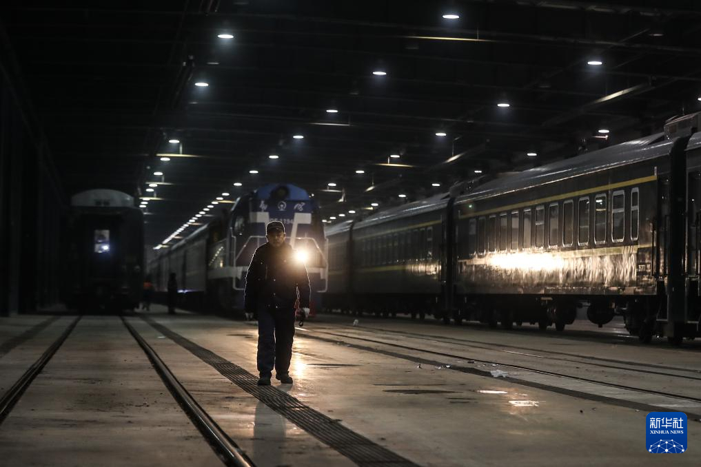 2月4日,田鶴在沈陽車輛段沈陽北整備庫內,準備對一列普速列車進行檢修工作。新華社記者 潘昱龍 攝