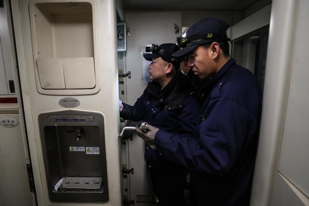 2月5日,田鶴(左)與同事在維修一列普速列車上的電開水爐。新華社記者 潘昱龍 攝pagebreak