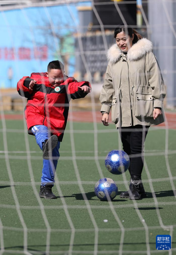 3月1日,鳳城特殊教育學校的老師趙閱(右)陪學生遲云崢在操場上踢球。新華社記者 姚劍鋒 攝pagebreak