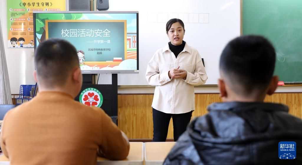 3月1日,鳳城特殊教育學校的老師趙閱給學生講開學第一課——校園活動安全。新華社記者 姚劍鋒 攝pagebreak