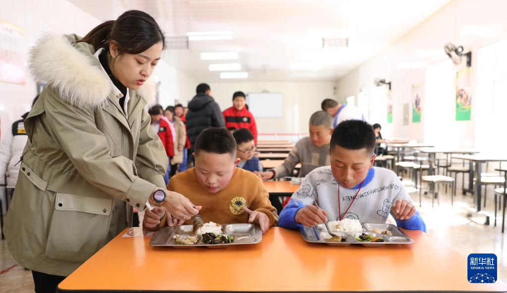 3月1日,午餐時間,鳳城特殊教育學校的老師趙閱(左)在食堂照顧學生吃飯。新華社記者 姚劍鋒 攝pagebreak