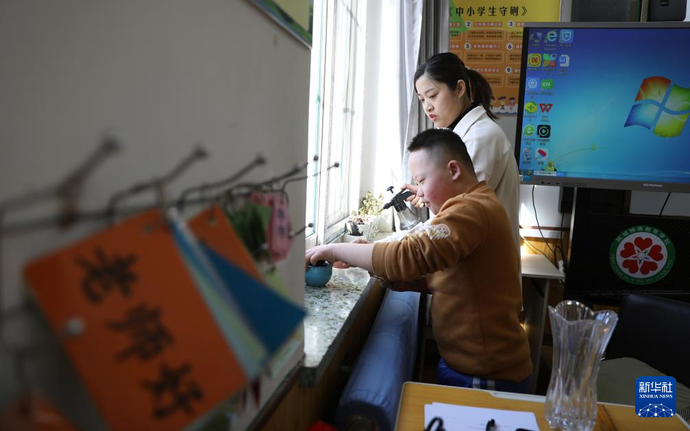 3月1日,鳳城特殊教育學校的老師趙閱(后)和學生遲云崢一起整理教室窗臺,讓孩子們提高自理和動手能力是特殊教育的重要內容。新華社記者 姚劍鋒 攝pagebreak