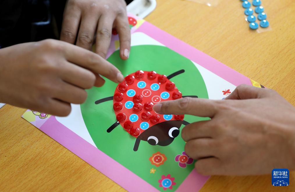 3月1日,鳳城特殊教育學校的老師趙閱在課堂上帶著學生做手工,訓練孩子們的手部精細動作。新華社記者 姚劍鋒 攝pagebreak