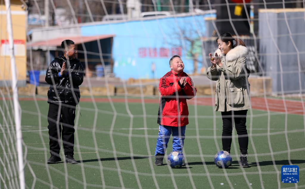 3月1日,鳳城特殊教育學校的老師趙閱(右)和學生遲云崢(中)、姜承伯來到操場上踢球。射門前,遲云崢說要給自己加油,趙閱和姜承伯為他鼓起掌來。新華社記者 姚劍鋒 攝pagebreak