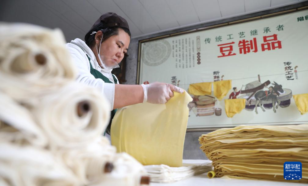 3月22日,呂計磨坊創始人計飛飛在自家制作手工干豆腐。新華社記者 姚劍鋒 攝