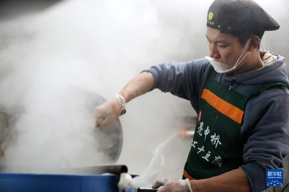 3月21日,工人在亮中橋鎮的昌圖紅瑞食品釀造有限公司車間豆漿鍋內一邊點鹵水,一邊進行攪拌。新華社記者 姚劍鋒 攝