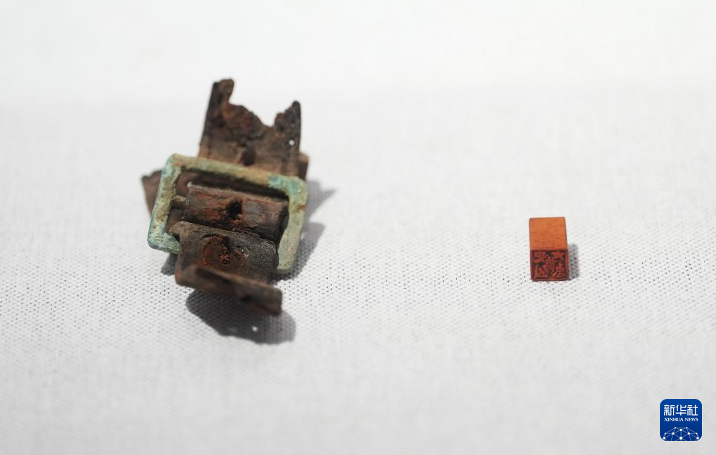 史萬忠烈士遺物展柜里的印章(右)和皮帶扣。新華社記者 李鋼 攝